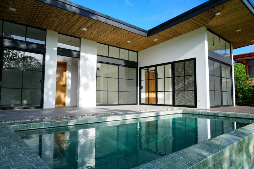 The interior and exteriors walls are 100% constructed with concrete and the whole house is tiled with non-slippery tiles. It has an infinity pool with Sukabumi natural rock. The sliding doors/windows open from either side to offer an open concept. LED lights are installed thought the house, The exteriors ceiling is made of “Caña brava”.